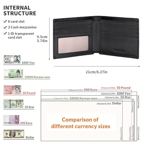 • Exquisite Design: This men's wallet is uniquely designed : 8credit card slots,1 ID windows 2 cash mezzanine. With plenty of storage and simple access, this bifold wallet was crafted for efficiency and extra capacity.