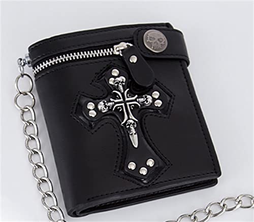 • Bifold biker wallet chain, goth wallet for men with chain, punk cross clasp skull chain billfold with snap closure for women.