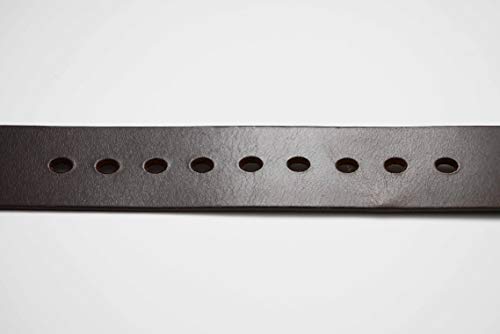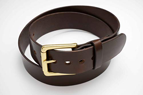 • This thick full grain leather belt is built to last a lifetime. Each belt strap is cut directly from prepared cowhides. The edges are then hand burnished and painted giving the belt a clean finished edge. The holes in the single prong belts are oblong to prevent the leather from stretching. Four Chicago screws are set to hold our solid brass or stainless steel roller or slider buckle and matching leather keeper in place.
