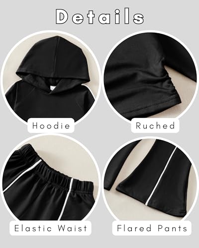 • Stylish Design: This girls outfits features a ruched hoodie top with long sleeves that add a cute and modern touch. The flare pants are designed with a classic bell-bottom cut that visually elongates the legs, while side stripes provide a sporty accent. The relaxed fit makes it easy to wear for various daily activities.