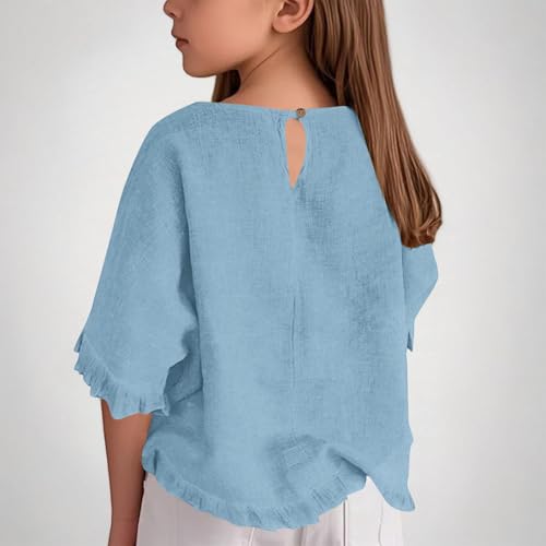 Girls Round Neck Ruffled Hem Sleeve Shirt Cotton Linen Top Short Sleeve Blouses Breathable Tops for Kids 5-15 Years 7