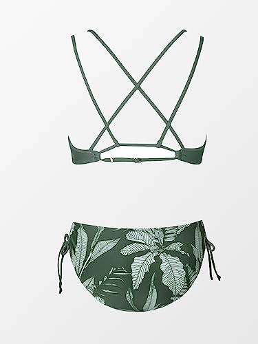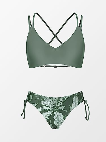 • Design: Crush on this flirty two piece bikini set with double spaghetti straps, featuring v neck and crisscross back. Matching a low rise tie side tropical bottom piece. About cup style: with removable pads