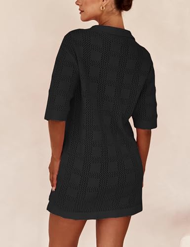 • 【Special Design】Soft knit hallow out crochet fabric, short sleeves, collared neckline, loose fit, solid colors, above knee length.