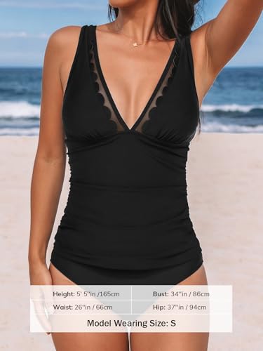 CUPSHE Women's Tankini Sets V Neck Mesh Scalloped Two Piece Bathing Suits Adjustable Straps Mid Rise Swimwear 1