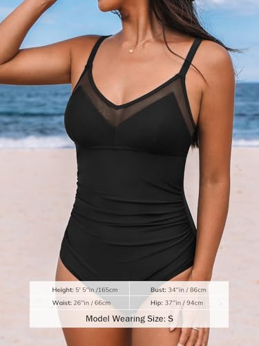 • Design: The Stylish One Piece Swimsuit Features Mesh V Neck and Cutout Design Make You Looks Flattering ; This Ruched Bathing Suit Features Back Hook And Adjustable Straps Give You Comfortable Feeling