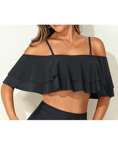 • The black double flounce bikini top features a sturdy, adjustable bra style with shoulder straps, soft pads, and an elastic band to ensure a secure fit. You can pair it with any bottom to create a simple yet stylish look.