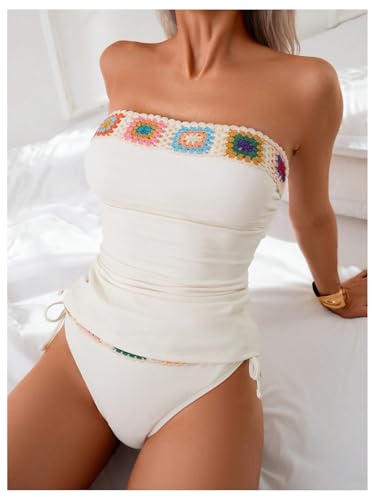 • Features: Two piece bandeau tankini sets for women, floral crochet, tie backless strapless bathing suit, drawstring high rise tummy control thong swimsuit