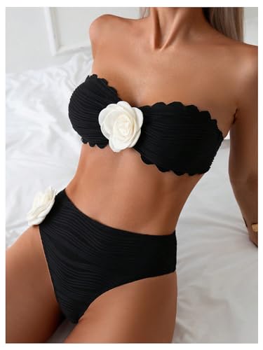 HOT ! OYOANGLE Women's 2 Piece Strapless Bikini Sets 3D Floral Scallop Trim Tie Back Low Rise Bathing Suit Textured Swimsuits