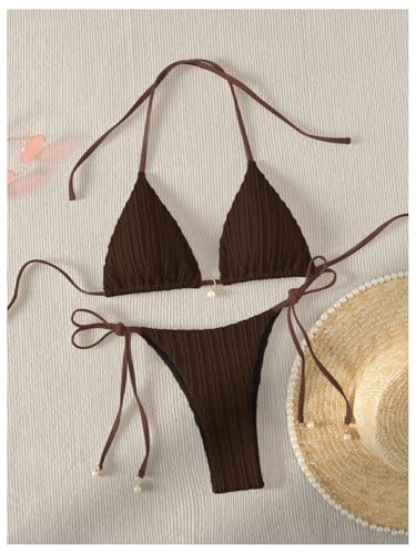 • Halter Swim Top, Tie at Neck and Back, Removable Padded, Self Tie Thong Bikini Bottom, Pearls Decor, Sexy Bikini Sets