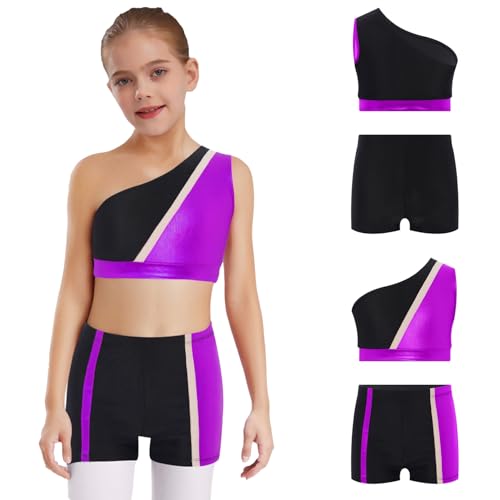 TiaoBug Kids Girls Pcs Metallic Color Block Gymnastics Dance Outfit One Shoulder Tank Top And Shorts Set 5