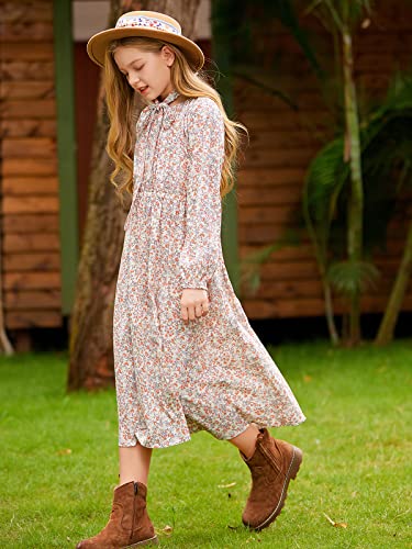 Girls Casual Elastic Crew Neck Floral Printed Solid Color A-line Swing High Waist Midi Belted Dress with Pocket 5