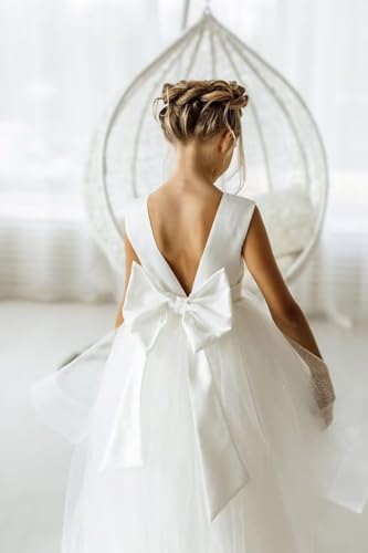 V-Back Flower Girl Dress for Wedding Satin Tulle Princess Pageant Dress Kids Pearls Prom Ball Gowns with Bow-Knot 6