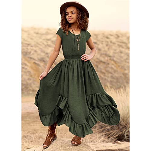 HOT ! EnJoCho Beach Midi Dress for Girls Swing Dress Irregular Rockabilly Vintage Solid Dresses Retro Short (Army Green, 9-10 Years)