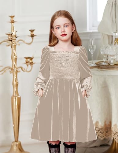HOT ! Arshiner Toddler Velvet Dress Girls Smocked Square Neck Puff Long Sleeve Party Dresses with Pockets 3-8Y