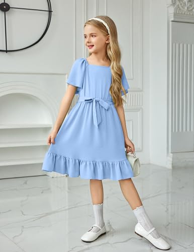 Arshiner Girls Dresses Kids Summer Square Neck Ruffle Hem Belted Dress with Pockets for 5-12 Years 6