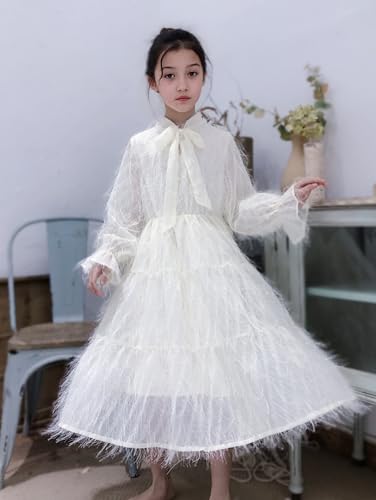 HOT ! New 5-14Y [Brand Name] Girls White Feathered Dress Long Sleeve Tie Neck Boho Ethereal Party Photoshoot