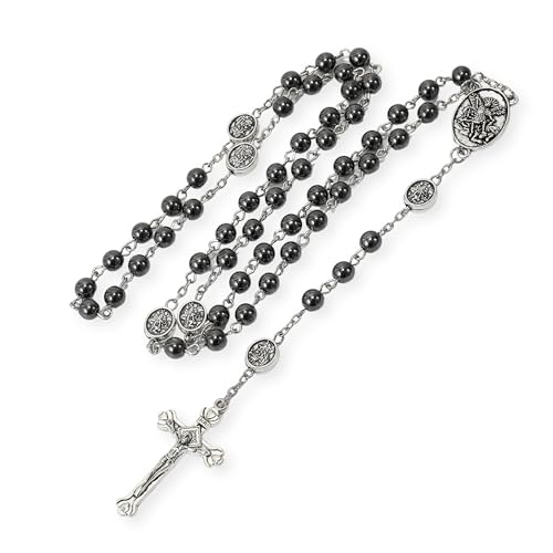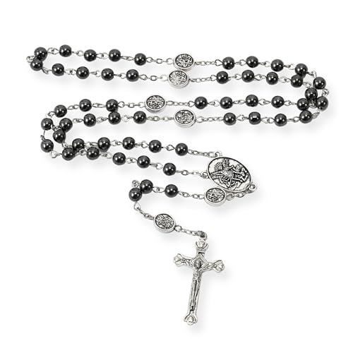 Nazareth Store St Michael Rosary Hematite Stone Beads Necklace Metal Beaded Glory Beads Archangel Medal & Cross with Metal Gift Box 1