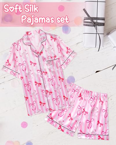 Sylfairy Girls Pajamas Silk PJS Set Pink Bow Satin Sleepwear Short Sleeve Jammies for Kids Button-Down Nightwear size 7-14 6