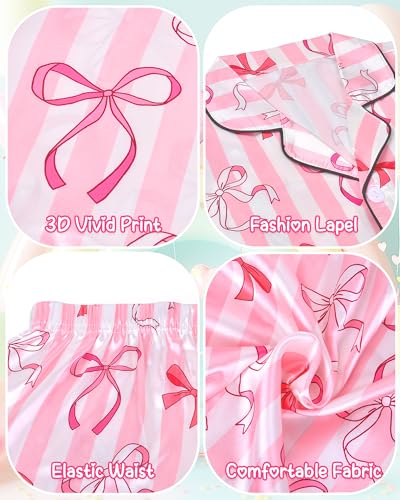 Sylfairy Girls Pajamas Silk PJS Set Pink Bow Satin Sleepwear Short Sleeve Jammies for Kids Button-Down Nightwear size 7-14 2