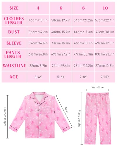 • 2. Girls Satin Pajamas Set: Long sleeve notch collar button-down top match elastic waist pants. Simple design with chest pocket. This 2-piece pajama set is the perfect jammies for kids girls.