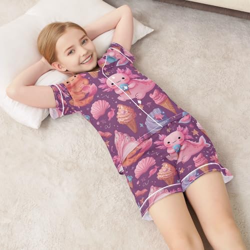 Satin Pajama Sets Short Sleeve Cute Axolotls Ice Cream Button Down Silky Nightwear 2 Piece PJS 5-14Y 6