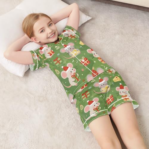 Satin Pajama Sets Short Sleeve Christmas Mice with Cheese Button Down Silky Nightwear 2 Piece PJS 5-14Y 6