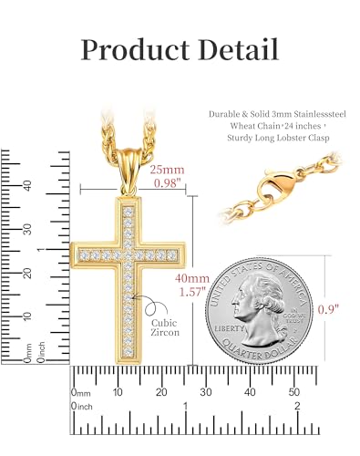 Stainless Steel CZ Cross Necklace Men Women - 18K Gold Plated 5A+ Cubic Zirconia Crucifix Pendant - Christian Religious 3mm Rolo Chain Jewelry Present 5