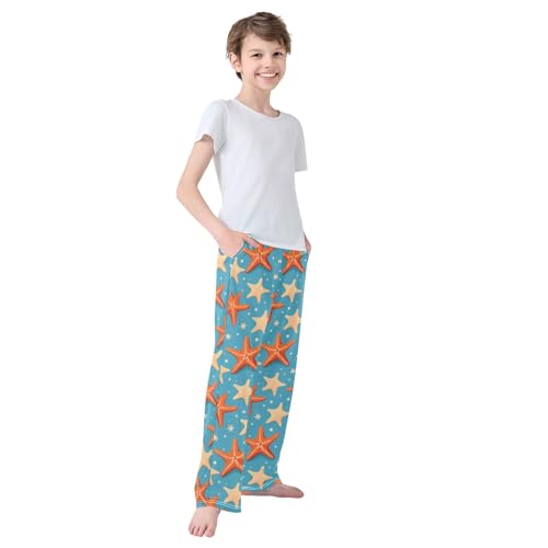 HOT ! Orange Starfish Pattern Pajama Pants Lounge Sleep Pants Elastic Waist Long Pajama Bottoms with Pockets for 6-14 Years