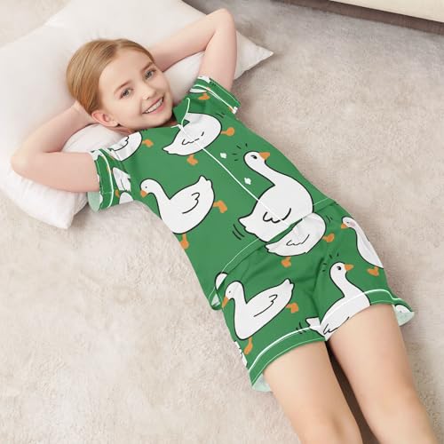 Satin Pajama Sets Short Sleeve Green Background with White Ducks Button Down Silky Nightwear 2 Piece PJS 5-14Y 6