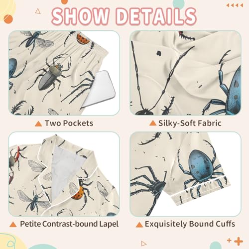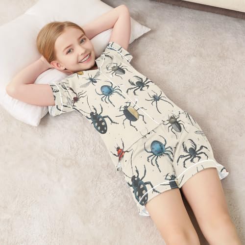 Satin Pajama Sets Short Sleeve Insects Pattern Print Cartoon Button Down Silky Nightwear 2 Piece PJS 5-14Y 7