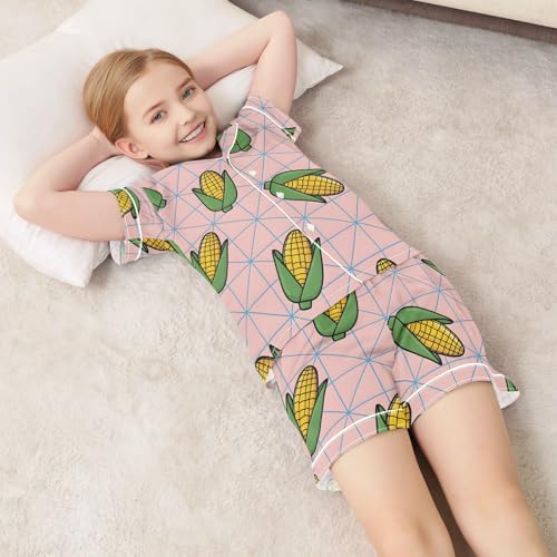 Satin Pajama Sets Short Sleeve Cartoon Corn Pink Background Button Down Silky Nightwear 2 Piece PJS 5-14Y 6