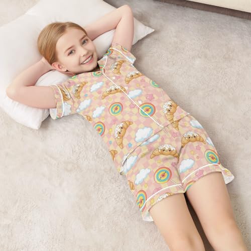 Satin Pajama Sets Short Sleeve Cute Croissant and Lollipops Button Down Silky Nightwear 2 Piece PJS 5-14Y 1