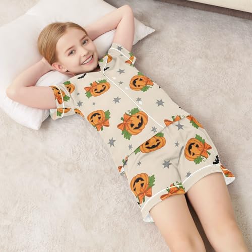 Satin Pajama Sets Short Sleeve Pumpkin Pattern with Bats Stars Button Down Silky Nightwear 2 Piece PJS 5-14Y 1