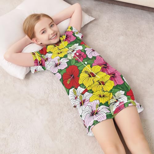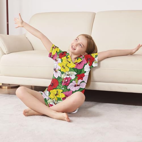 Multicolor Hibiscus Summer Pajamas Set Soft Satin Pjs Sets 2 Piece Short Sleeve Sleepwear Casual Clothes 1