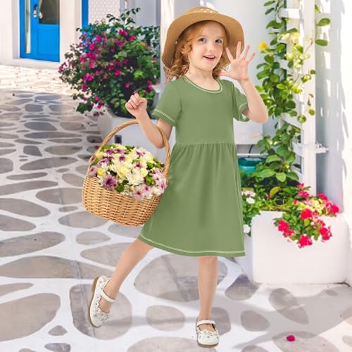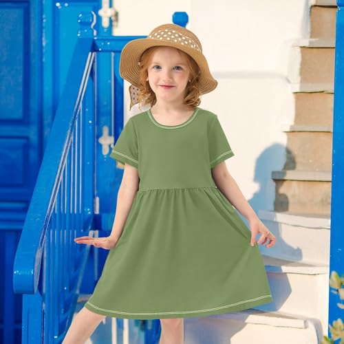 Dark Olive Green Toddler Girl Dress Summer Short Sleeve A-Line UPF50+ Casual Sundress for Girls 2T-8T Playwear Outfits 2