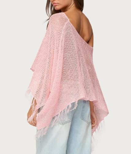 More information about Women Sheer Poncho Top Fringed Off The Shoulder Hollow Out Knit Tops Sequin Crochet Poncho Shawl Cover Up Tops