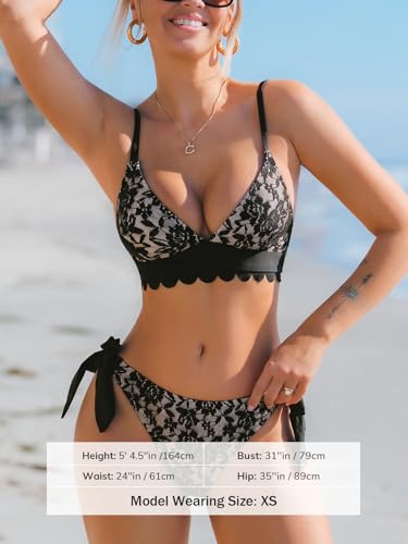 CUPSHE Women's Bikini Sets Two Piece Swimsuit V Neck Lace Sexy Bathing Suit Scalloped Trim Low Rise Side Self Tie 2