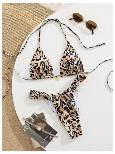 Women's Leopard Print High Cut Swimsuits 2 Piece Tie Backless Halter Triangle Bikini Set Cheetah Bathing Suits 2