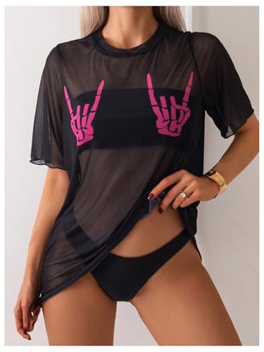 Verdusa Women's Skull Hand Print Beach Cover Ups Swimsuit Vintage Short Sleeve Crew Neck Mini Dress 1