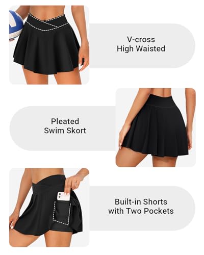Zmart High Waisted Swim Skirt - Women V Cross Bathing Suit Pleated Skorts Bottom with Boxer Liner & Pockets 5