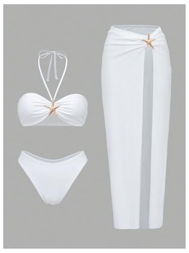 HOT ! Verdusa Women's 3 Piece Swimsuit Metal Decor Halter Bikini Set with Maxi Cover Up Skirt