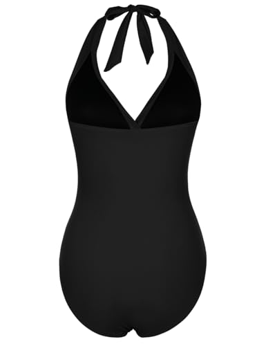 Women's One Piece Swimsuits V Neck Shirred Swimwear Tummy Control Halter Bathing Suits Monokini Black 12 1