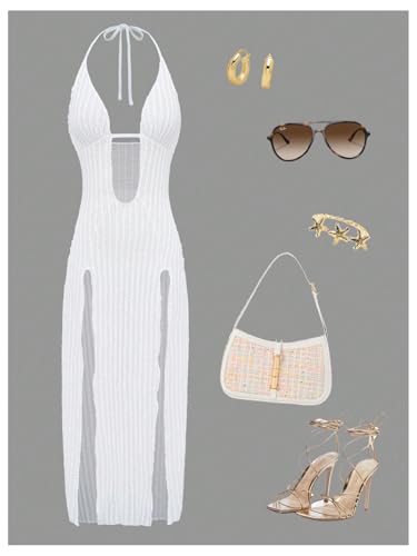 More information about GORGLITTER Women's Sexy Beach Cover Up Double Slit Halter Backless Dress Summer Outfits 2025