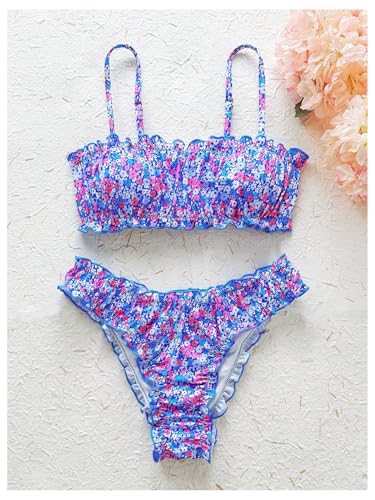 HOT ! MakeMeChic Women's Two Piece Bikini Set Floral Frill Trim Spaghetti Strap Bathing Suit Beachwear
