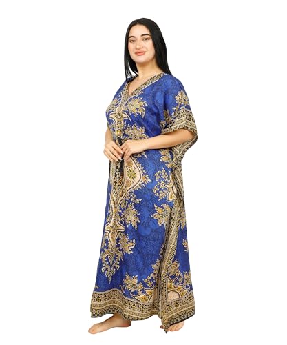 • SIZE: This digitally printed colourful Kaftan is One Size / Free Size. Loose and comfortable to fit any size. Length-52" Bust-30 X 2, i.e., 60 inches(seam to seam). V-Neck - 10 Inches. The drawstring at the waistline can be tightened as much as required or left relaxed as per wish.