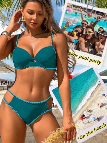 More information about Women Sexy 2 Piece Molded Cup Bikini Set, Underwire Push Up Bathing Suit, Color Block Shell Stitched Cheeky Swimsuit