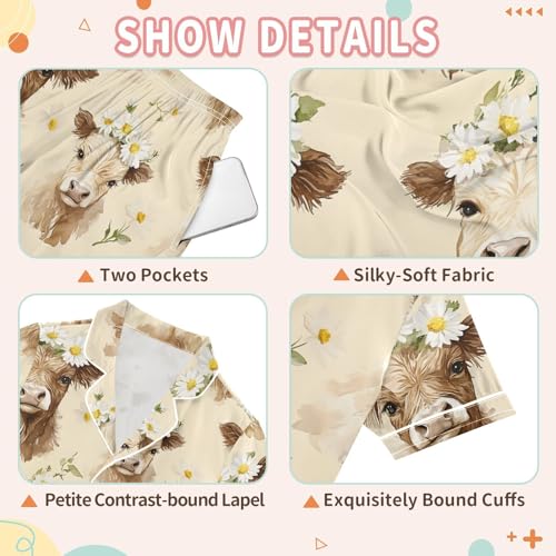 ALAZA Highland Cattle Blossom Floral Satin Pajamas Set Short Sleeve Button Down Sleepwear Summer Pjs 2 Piece 4