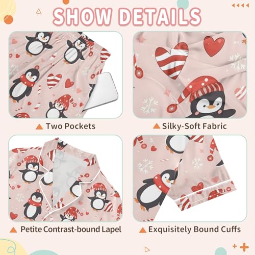 Cute Winter Penguin Prints Pattern Summer Satin Pajama Set, Cute Button-Down Sleepwear Pj Set for Sleep Wears 6