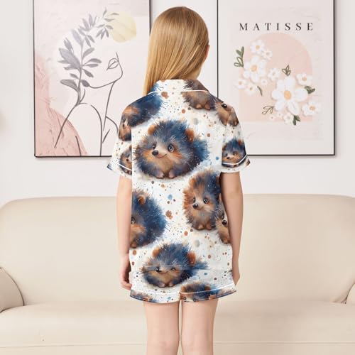 senya Cute Hedgehog Watercolor Satin Summer Pajama Sets Silk Short Sleeve Button Down Sleepwear 1