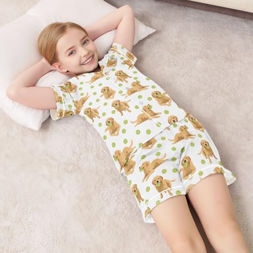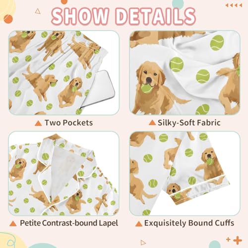 HOT ! Golden Retriever Tennis Ball Pattern Summer Satin Pajama Set, Cute Button-Down Sleepwear Pj Set for Sleep Wears